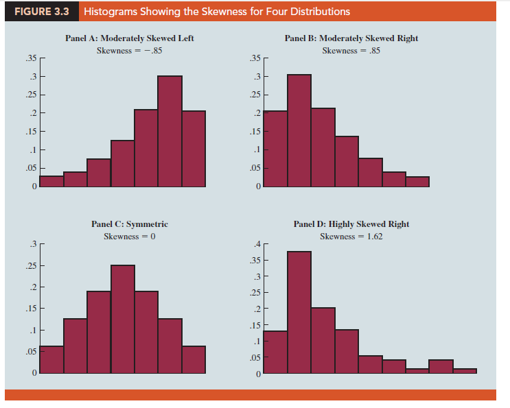 Figure 3.3 shows four histograms constructed from relative frequency distributions. The histograms in Panels A and B are moderately skewed. The one in Panel A is skewed to the left; its skewness is -.85. The histogram in Panel B is skewed to the right; its skewness is + .85. The histogram in Panel C is symmetric; its skewness is zero. The histogram in Panel D is highly skewed to the right; its skewness is 1.62. The formula used to compute skewness is somewhat complex.1 However, the skewness can easily be computed using statistical software. For data skewed to the left, the skewness is negative; for data skewed to the right, the skewness is positive. If the data are symmetric, the skewness is zero.