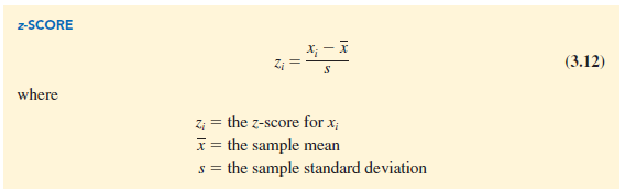 By using both the mean and standard deviation, we can determine the relative location of any observation. Suppose we have a sample of n observations, with the values denoted by xv x2, . . . , xn. In addition, assume that the sample mean, X, and the sample standard deviation, 5, are already computed. Associated with each value, xt, is another value called its z-score. Equation (3.12) shows how the z-score is computed for each x;.