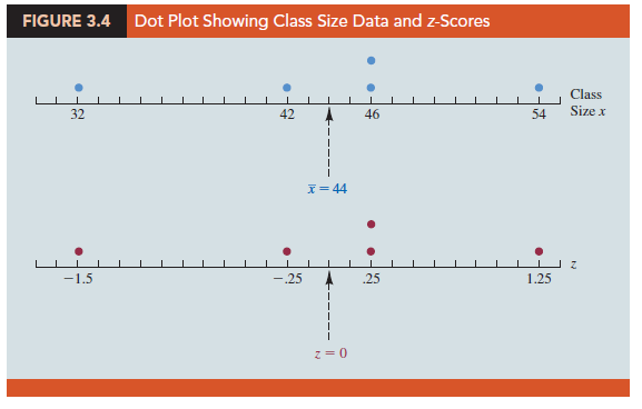 The z-scores for the class size data from Section 3.1 are computed in Table 3.5. Recall the previously computed sample mean, x = 44, and sample standard deviation, s = 8. The z-score of -1.50 for the fifth observation shows it is farthest from the mean; it is 1.50 standard deviations below the mean. Figure 3.4 provides a dot plot of the class size data with a graphical representation of the associated z-scores on the axis below.