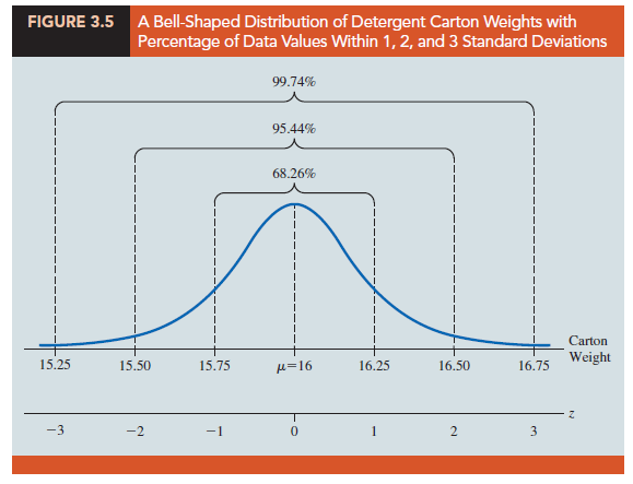 For example, liquid detergent cartons are filled automatically on a production line. Filling weights frequently have a bell-shaped distribution. If the mean filling weight is 16 ounces and the standard deviation is .25 ounces, we can use the empirical rule to draw the following conclusions.