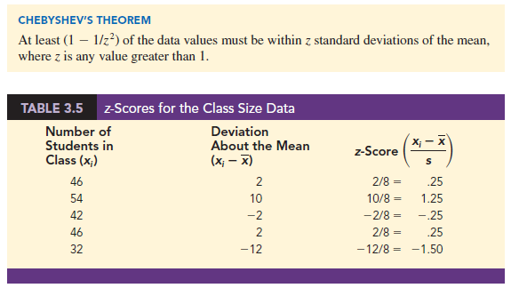 By using both the mean and standard deviation, we can determine the relative location of any observation. Suppose we have a sample of n observations, with the values denoted by xv x2, . . . , xn. In addition, assume that the sample mean, X, and the sample standard deviation, 5, are already computed. Associated with each value, xt, is another value called its z-score. Equation (3.12) shows how the z-score is computed for each x;.
