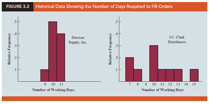 For most firms, receiving materials and supplies on schedule is important. The 7- or 8-day deliveries shown for J.C. Clark Distributors might be viewed favorably; however, a few of the slow 13- to 15-day deliveries could be disastrous in terms of keeping a workforce busy and production on schedule. This example illustrates a situation in which the variability in the delivery times may be an overriding consideration in selecting a supplier. For most purchasing agents, the lower variability shown for Dawson Supply, Inc., would make Dawson the preferred supplier.