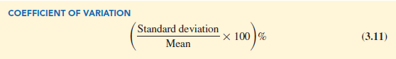 For the class size data, we found a sample mean of 44 and a sample standard deviation of 8. The coefficient of variation is [(8/44) x 100]% = 18.2%. In words, the coefficient of variation tells us that the sample standard deviation is 18.2% of the value of the sample mean. For the starting salary data with a sample mean of 3940 and a sample standard deviation of 165.65, the coefficient of variation, [(165.65/5940) X 100]% = 2.8%, tells us the sample standard deviation is only 2.8% of the value of the sample mean. In general, the coefficient of variation is a useful statistic for comparing the variability of variables that have different standard deviations and different means.