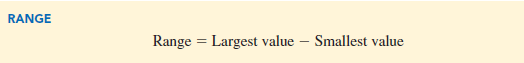 Let us refer to the data on starting salaries for business school graduates in Table 3.1. The largest starting salary is 6325 and the smallest is 5710. The range is 6325 – 5710 = 615.