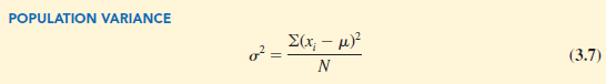 If the data are for a population, the average of the squared deviations is called the population variance. The population variance is denoted by the Greek symbol s2. For a population of N observations and with m denoting the population mean, the definition of the population variance is as follows.
