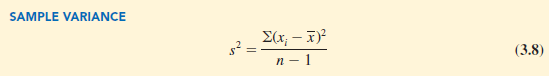 In most statistical applications, the data being analyzed are for a sample. When we compute a sample variance, we are often interested in using it to estimate the population variance s2. Although a detailed explanation is beyond the scope of this text, it can be shown that if the sum of the squared deviations about the sample mean is divided by n – 1, and not n, the resulting sample variance provides an unbiased estimate of the population variance. For this reason, the sample variance, denoted by s2, is defined as follows.