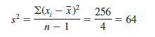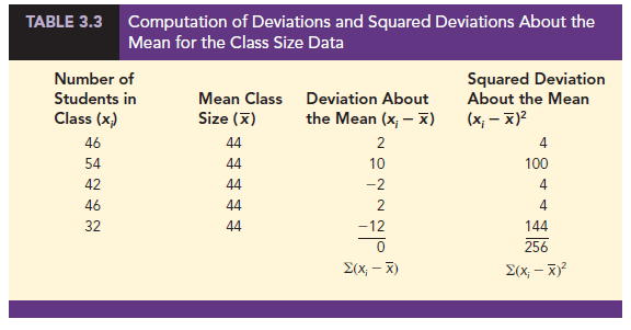 To illustrate the computation of the sample variance, we will use the data on class size for the sample of five college classes as presented in Section 3.1. A summary of the data, including the computation of the deviations about the mean and the squared deviations about the mean, is shown in Table 3.3. The sum of squared deviations about the mean is S(xi – X )2 = 256. Hence, with n – 1 = 4, the sample variance is