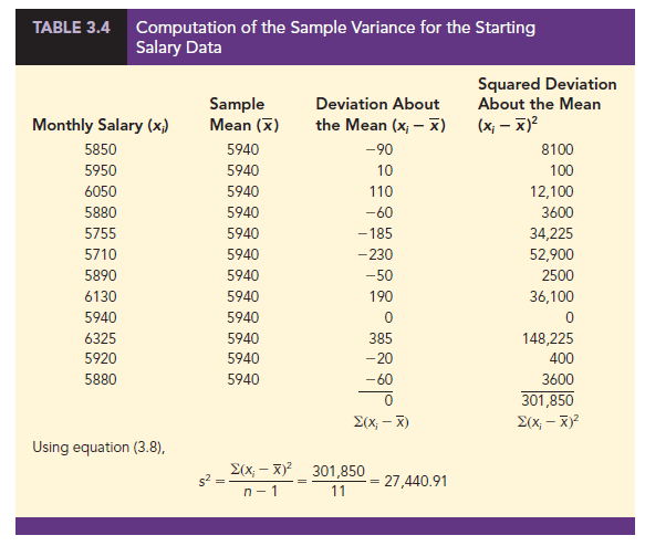 As another illustration of computing a sample variance, consider the starting salaries listed in Table 3.1 for the 12 business school graduates. In Section 3.1, we showed that the sample mean starting salary was 5940. The computation of the sample variance (s2 = 27,440.91) is shown in Table 3.4.