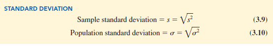 What is gained by converting the variance to its corresponding standard deviation? Recall that the units associated with the variance are squared. For example, the sample variance for the starting salary data of business school graduates is s[1] [2] [3] = 27,440.91 (dollars).2 Because the standard deviation is the square root of the variance, the units of the variance, dollars squared, are converted to dollars in the standard deviation. Thus, the standard deviation of the starting salary data is $165.65. In other words, the standard deviation is measured in the same units as the original data. For this reason the standard deviation is more easily compared to the mean and other statistics that are measured in the same units as the original data.