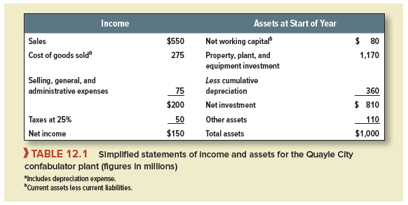 Look at Table 12.1, which contains a simplified income statement and balance sheet for your company’s Quayle City confabulator plant. There are two methods for judging whether the plant’s returns are higher than the cost of capital.