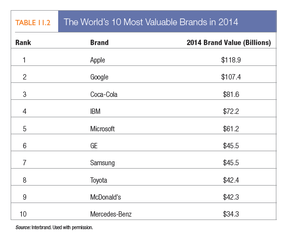 Marketers should distinguish brand equity from brand valuation, which is the job of estimating the total financial value of the brand. Table 11.2 displays the world’s most valuable brands in 2012 according to the Interbrand rankings, as described below in “Marketing Insight: What Is a Brand Worth?”61 In these well-known companies, brand value is typically more than half the total company market capitalization. John Stuart, cofounder of Quaker Oats, said: “If this business were split up, I would give you the land and bricks and mortar, and I would take the brands and trademarks, and I would fare better than you.” U.S. companies do not list brand equity on their balance sheets, in part because of differences in opinion about what constitutes a good estimate. However, companies do give it a value in countries such as the United Kingdom, Hong Kong, and Australia.