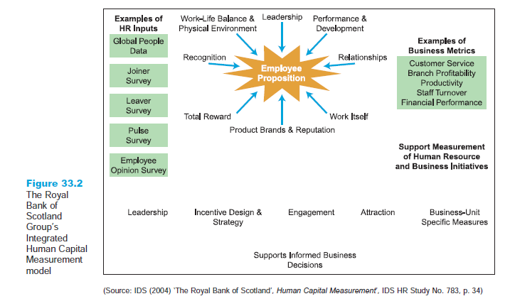 There are a variety of models that can be used and Matthewman and Matignon (2005) identify six such frameworks: the human resource benchmarking model; the balanced scorecard; the human capital monitor; the human capital index; the engagement model; and the organisational performance model. We look at the Human Resource Scorecard and Mayo’s Human Capital Monitor in more detail below, and the Window on practice is about the Royal Bank of Scotland Group who use the engagement model.