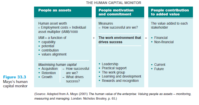 An alternative framework for monitoring, measuring and managing human capital is the ‘human capital monitor’ and this has been developed in the UK by Andrew Mayo (2001). The human capital monitor is designed to connect the intrinsic value of the human capital in the organisation with the working environment. It includes processes and systems which impact on employees’ behaviour together with the value that is created by people. As with the previous models discussed this is not specifically designed for the HR function to monitor itself. The model adds together the value of people as assets (box 1) and the motivation and commitment (box 2) to produce the people contribution to added value (box 3). The model is shown in Figure 33.3.