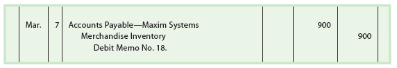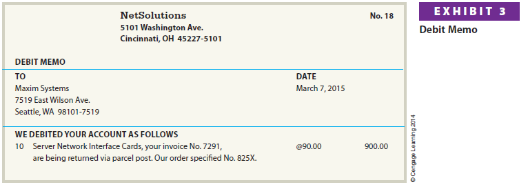 To illustrate, NetSolutions records the return of the merchandise indicated in the debit memo in Exhibit 3 as follows: