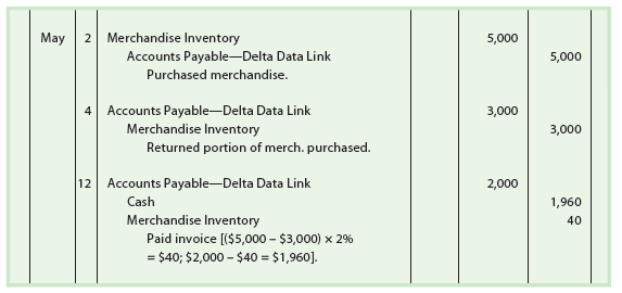 May 2. Purchased $5,000 of merchandise on account from Delta Data Link, terms 2/10, n/30.