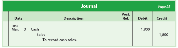 Cash Sales A business may sell merchandise for cash. Cash sales are normally entered on a cash register and recorded in the accounts. To illustrate, assume that on March 3, NetSolutions sells merchandise for $1,800. These cash sales are recorded as follows: