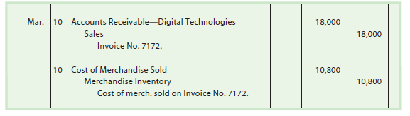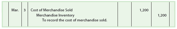To illustrate, assume that the cost of merchandise sold on March 3 is $1,200. The entry to record the cost of merchandise sold and the decrease in the merchandise inventory is as follows: