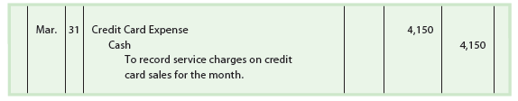 If customers use MasterCards to pay for their purchases, the sales would be recorded exactly as shown in the March 3 entry at the top of the page. Any processing fees charged by the clearinghouse or issuing bank are periodically recorded as an expense. This expense is normally reported on the income statement as an administrative expense. To illustrate, assume that NetSolutions paid credit card processing fees of $4,150 on March 31. These fees would be recorded as follows: