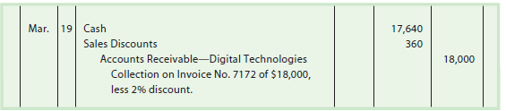 To illustrate, assume that NetSolutions sold $18,000 of merchandise to Digital Technologies on March 10 with credit terms 2/10, n/30. Under the credit terms, Digital Technologies has until March 20 (March 10 plus 10 days) to pay within the discount period. Assume that Digital Technologies pays the invoice on March 19. Since the invoice is paid within the discount period (10 days), Digital Technologies would deduct $360 ($18,000 x 2%) from the invoice amount of $18,000 and pay $17,640. NetSolutions would record the receipt of the cash as follows: