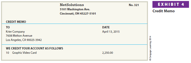If the return or allowance is for a sale on account, the seller usually issues the buyer a credit memorandum, often called a credit memo. A credit memo authorizes a credit (decrease) to the buyer’s account receivable. A credit memo indicates the amount and reason for the credit. An example of a credit memo issued by NetSolutions is shown in Exhibit 4.