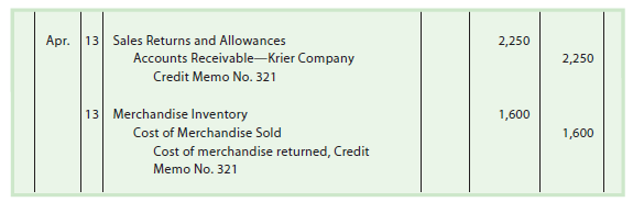 To illustrate, the credit memo shown in Exhibit 4 is used. The selling price of the merchandise returned in Exhibit 4 is $2,250. Assuming that the cost of the merchandise returned is $1,600, the sales return and allowance would be recorded as follows: