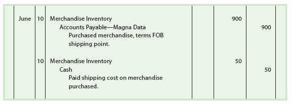June 10. Purchased merchandise from Magna Data, $900, terms FOB shipping point.