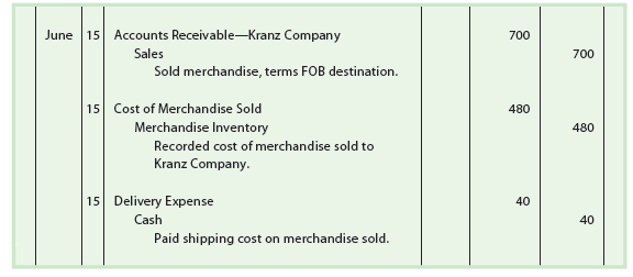 June 15. Sold merchandise to Kranz Company on account, $700, terms FOB destination. The cost of the merchandise sold is $480.