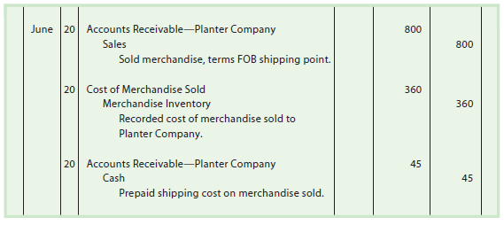 June 20. Sold merchandise to Planter Company on account, $800, terms FOB shipping point. NetSolutions paid freight of $45, which was added to the invoice. The cost of the merchandise sold is $360.