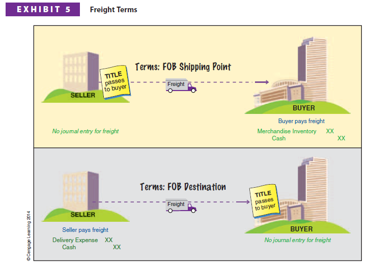 The ownership of the merchandise may pass to the buyer when the seller delivers the merchandise to the freight carrier. In this case, the terms are said to be FOB (free on board) shipping point. This term means that the buyer pays the freight costs from the shipping point to the final destination. Such costs are part of the buyer’s total cost of purchasing inventory and are added to the cost of the inventory by debiting Merchandise Inventory.