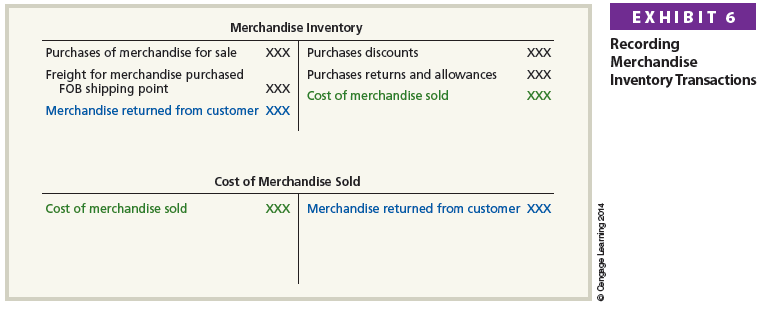 Recording merchandise inventory transactions under the perpetual inventory system has been described and illustrated in the preceding sections. These transactions involved purchases, purchases discounts, purchases returns and allowances, freight, sales, and sales returns from customers. Exhibit 6 summarizes how these transactions are recorded in T account form.