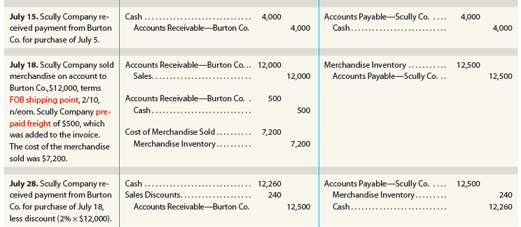 Each merchandising transaction affects a buyer and a seller. In the following illustration, the same transactions for a seller and buyer are recorded. In this example, the seller is Scully Company and the buyer is Burton Co.