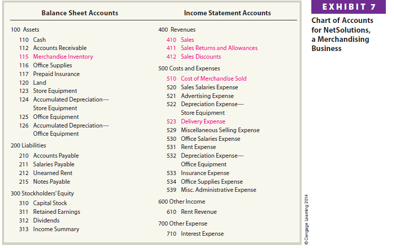 The chart of accounts for a merchandising business should reflect the types of merchandise transactions described and illustrated earlier in this chapter. The chart of accounts for NetSolutions is shown in Exhibit 7. The accounts related to merchandising transactions are shown in color.