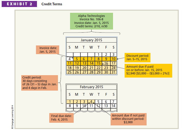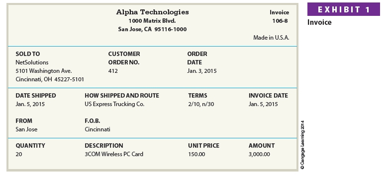 The terms of purchases on account are normally indicated on the invoice or bill that the seller sends the buyer. An example of an invoice sent to NetSolutions by Alpha Technologies is shown in Exhibit 1.