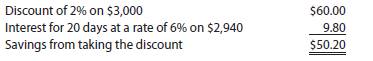 NetSolutions borrowed $2,940 at 6% to take the discount. If NetSolutions does not take the discount, it pays an estimated interest rate of 36% for using the $2,940 for the remaining 20 days of the credit period. Thus, buyers should normally take all available purchase discounts.