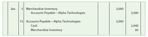 To illustrate, NetSolutions would record the Alpha Technologies invoice and its payment at the end of the discount period as follows: