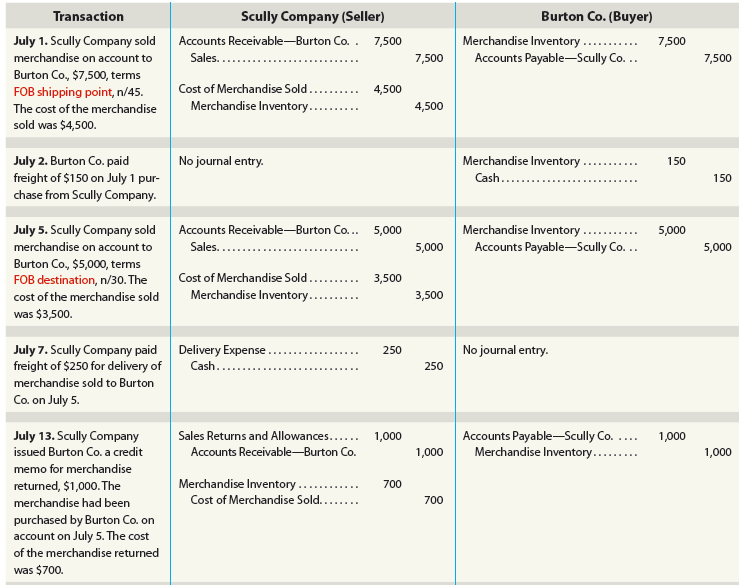 Each merchandising transaction affects a buyer and a seller. In the following illustration, the same transactions for a seller and buyer are recorded. In this example, the seller is Scully Company and the buyer is Burton Co.