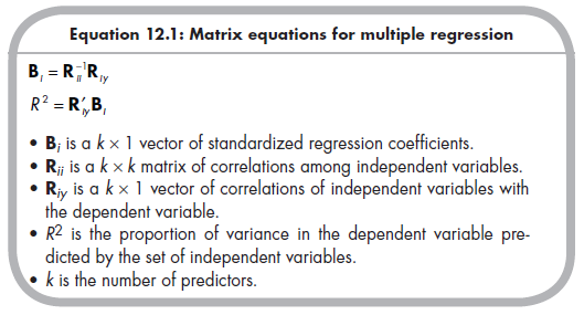 Multiple regression models fit linear equations between a set of predictors (independent variables) and a dependent variable. Of interest are both the unique prediction each independent variable has to the dependent variable above and beyond the other predictors in the model (i.e., the regression coefficient, B) and the overall prediction of the set (i.e., the variance in the dependent variable explained, R2). Both the standardized regression coefficients of each predictor and overall variance explained (i.e., squared multiple correlation, R2) can be estimated from (1) the correlations among the independent variables (a square matrix, R^, with the number of rows and columns equal to the number of predictors), and (2) the correlations of each independent variable with the dependent variable (a column vector, Rjy, with the number of rows equal to the number of predictors, using the following equations1 (Tabachnick & Fidell, 1996, p. 142):