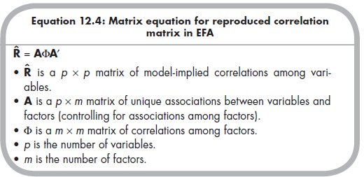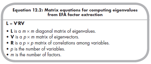 Although the matrix algebra of EFA can be a little daunting, all that is initially required is the correlation matrix (R) among the variables, which is a square matrix of p rows and columns (where p is the number of variables). From this correlation matrix, it is possible to compute a matrix of eigenvectors, V, which has p rows and m columns (where m is the number of factors).2