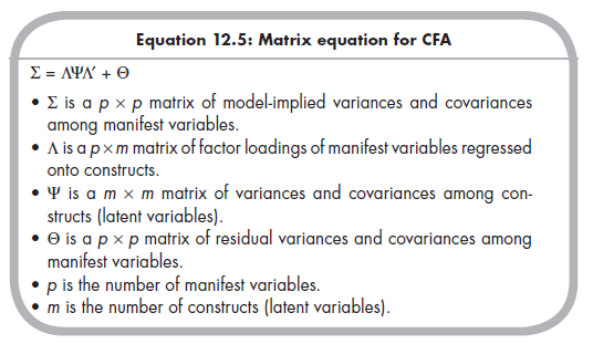 Like the EFA, the CFA estimates associations among factors (typically called “constructs” or “latent variables” in CFA) as well as strengths of associations between variables (often called “indicators” or “manifest variables” in CFA) and constructs. These parameters are estimated as part of the general CFA matrix equation6: