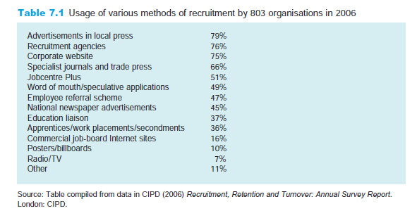 Once an employer has decided that external recruitment is necessary, a cost-effective and appropriate method of recruitment must be selected. There are a number of distinct approaches to choose from, each of which is more or less appropriate in different circumstances. As a result most employers use a wide variety of different recruitment methods at different times. In many situations there is also a good case for using different methods in combination when looking to fill the same vacancy. Table 7.1 sets out the usage of different methods reported in a recent CIPD survey of 802 UK employers (CIPD 2006).