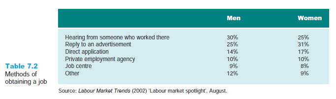 It is interesting to compare the figures in Table 7.1 with those reported in surveys of how people actually find their jobs in practice. These repeatedly show that informal methods (such as word of mouth and making unsolicited applications) are as common as, if not more common than, formal methods such as recruitment advertising. In 2002, the Labour Force Survey asked over a million people how they had obtained their current job. The results are shown in Table 7.2.