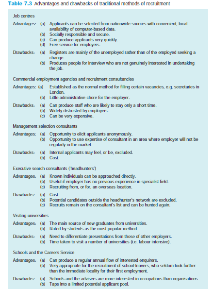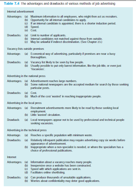 All the various methods of recruitment have benefits and drawbacks, and the choice of a method has to be made in relation to the particular vacancy and the type of labour market in which the job falls. A general review of advantages and drawbacks is given in Table 7.3.