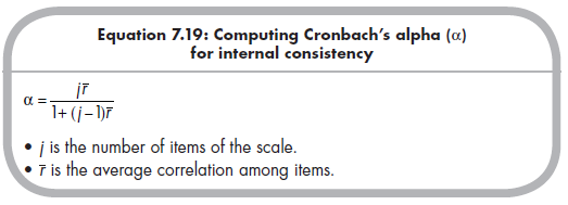 Internal consistency, or the internal reliability of a scale, indexes the magnitude to which items of a scale are homogeneous. The most widely used index of this internal consistency is Cronbach’s alpha, a (Cronbach, 1951), which can be computed based on the number of items in a scale (j) and the average correlation among these items (r):