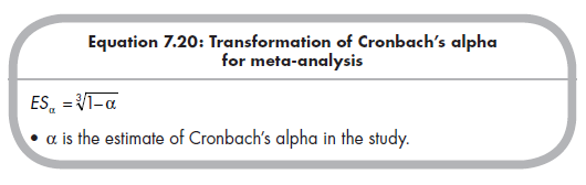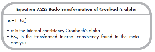 After computing the mean transformed internal consistency (as well as confidence interval limits or predicted values at different levels of moderators), you should back-transform results into the more interpretable Cron- bach’s alpha: