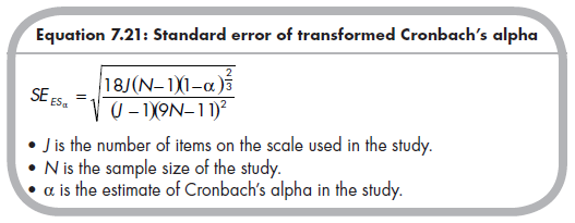 The standard error of this transformed internal consistency is a function of the number of items on the scale used in the study, the sample size, and the estimate of internal consistency itself (Rodriguez & Maeda, 2006):