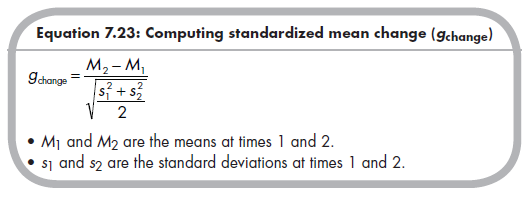 This equation is identical to that for the standardized mean difference (g) between independent groups shown in Chapter 5, if you recognize that the denominator is simply the pooled standard deviation across time. From this equation, you see that computing gchange from reported descriptive data is straightforward. One caveat is that you should be careful that the reported means and standard deviations at each time come from only the individuals who participated in both times. In other words, you need descriptive data from the nonattriting sample.10