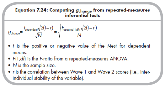 Although most research reports will provide these descriptive data, you may find instances where they do not. If the primary study reports only a repeated-measures £-test or ANOVA (F-ratio), along with the correlation between Waves 1 and 2 (i.e., interindividual stability), you can use this information to compute gchange using the following equation (which was also provided in Chapter 5):