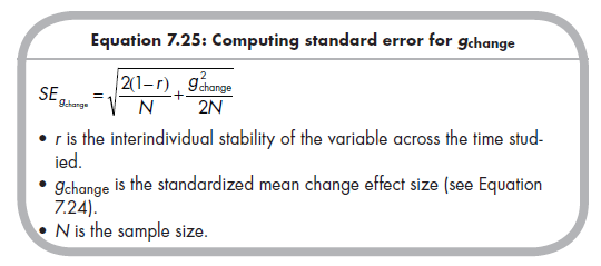 In addition to the effect size gchange, we also need to compute the standard error of this estimate for weighting in our meta-analysis. As you would expect, the standard error is dependent on the sample size; but it is also dependent on the interindividual stability (r) of the variable across time. It is critical to find this information in the research report for accurately computing this standard error; if it is not provided, you should seek to obtain this information from the study authors. The equation for the standard error for &hange is (Lipsey & Wilson, 2001, p. 44):