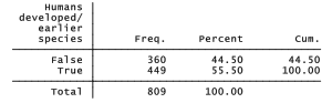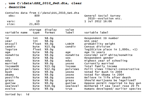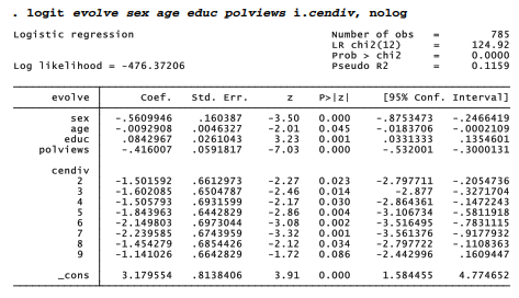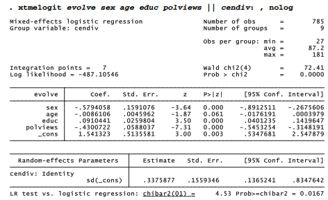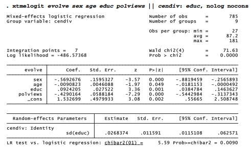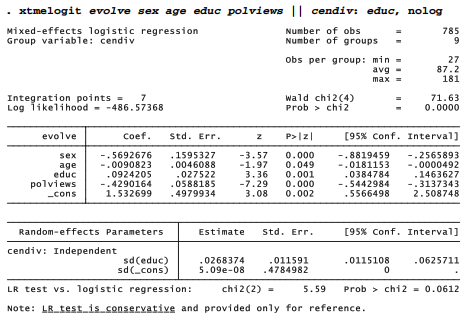 Non-missing values for evolve were the criterion for selecting this subset of 809 GSS respondents. “False” responses to evolve have been recoded as 0 and “True” as 1. The question of survey weighting, a complicated issue with multilevel modeling and not yet resolved for Stata’s mixed-effects logit command xtmelogit, is not addressed here.
