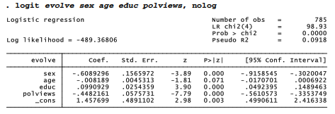 Research commonly finds that science literacy increases with education, and also is related to other background factors. In the case of evolve, we might expect some connection with political outlook as well. A simple logit regression confirms these hypotheses, finding that male, better educated, and politically moderate to liberal respondents more often believe in human evolution.